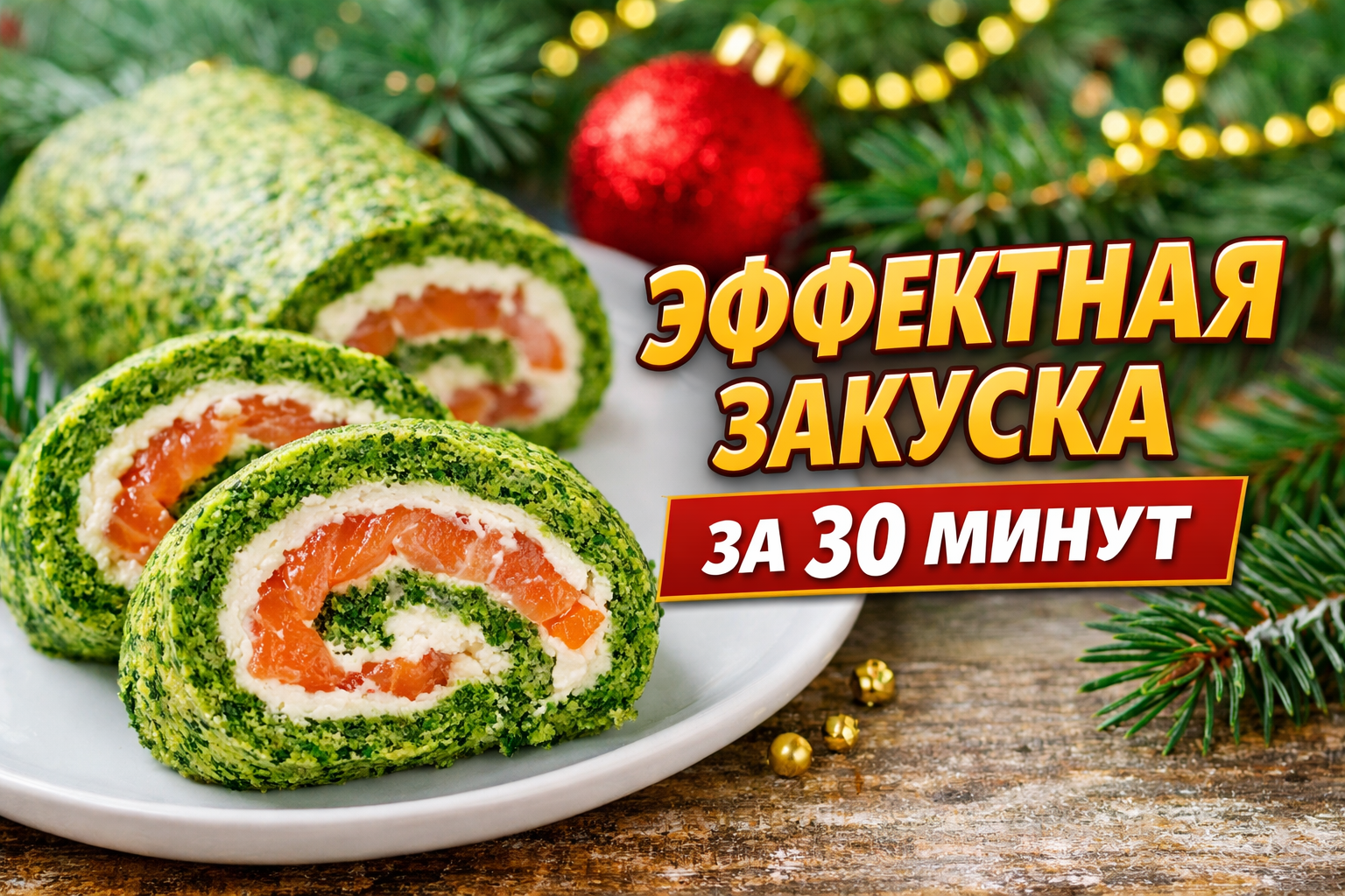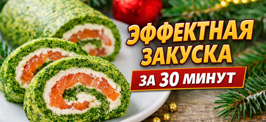 Нежный зелёный бисквит, сливочный сыр и слабосолёный лосось делают его не просто вкусным, а праздничным на вид. Такой рулет сразу притягивает взгляды на новогоднем столе.