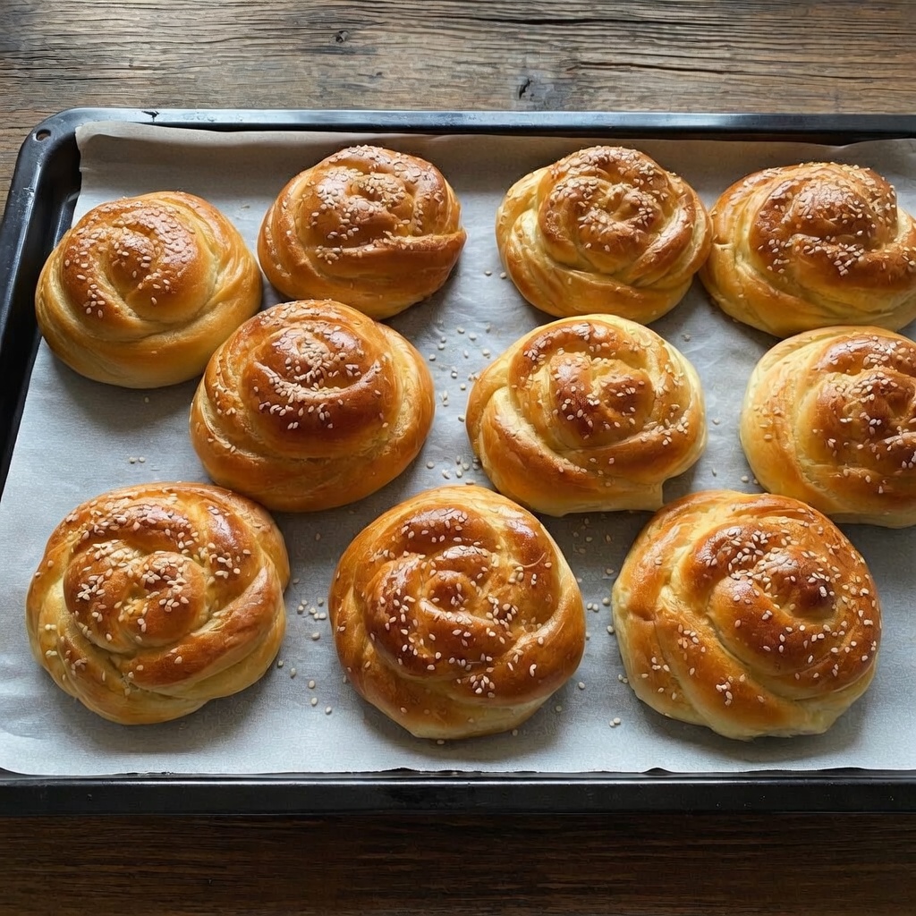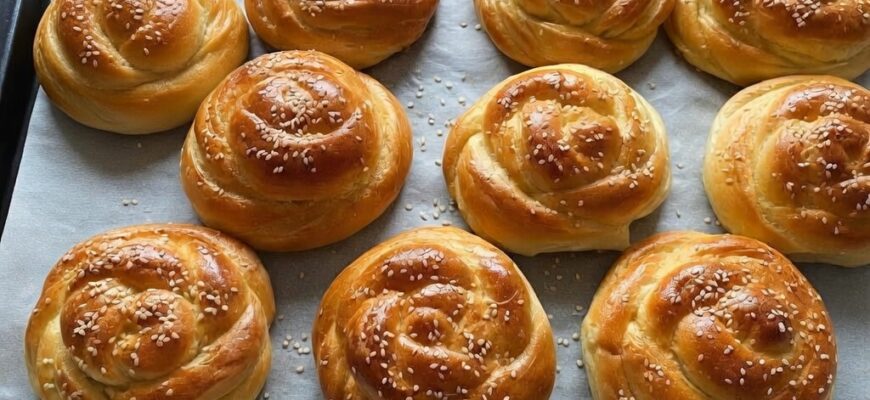 - Выпечка. Разогрейте духовку до 190°C. Смажьте булочки смесью желтка с водой, посыпьте кунжутом. Выпекайте 18–22 минуты до красивого золотисто-румяного цвета.